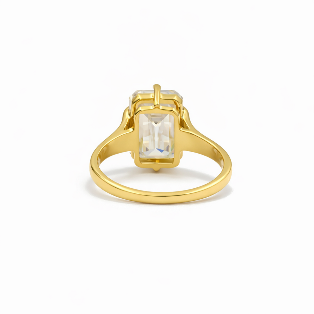 Eenheid prijs PerEen elegante ring met een indrukwekkende emerald cut moissanite steen. De strakke, langwerpige slijpvorm geeft de ring een moderne en luxueuze uitstraling, terwijl de steen het licht prachtig reflecteert.